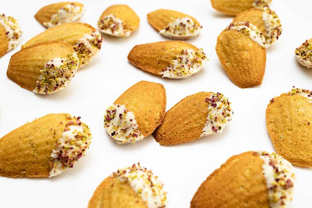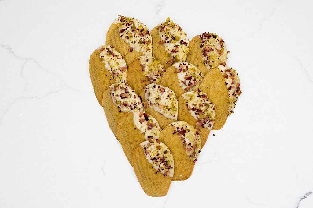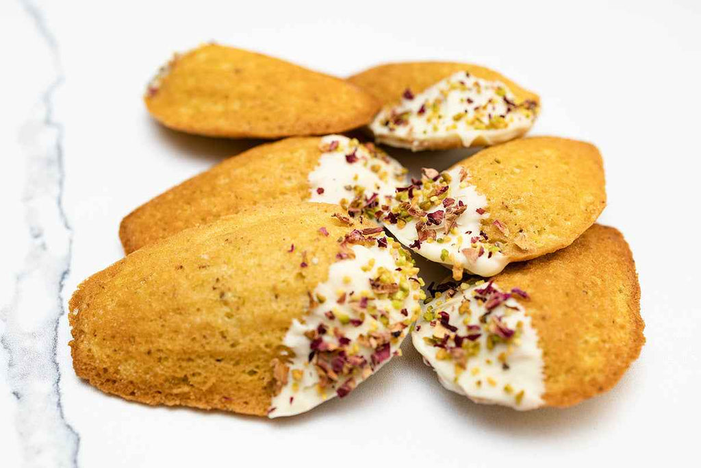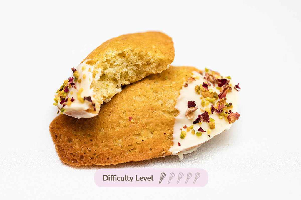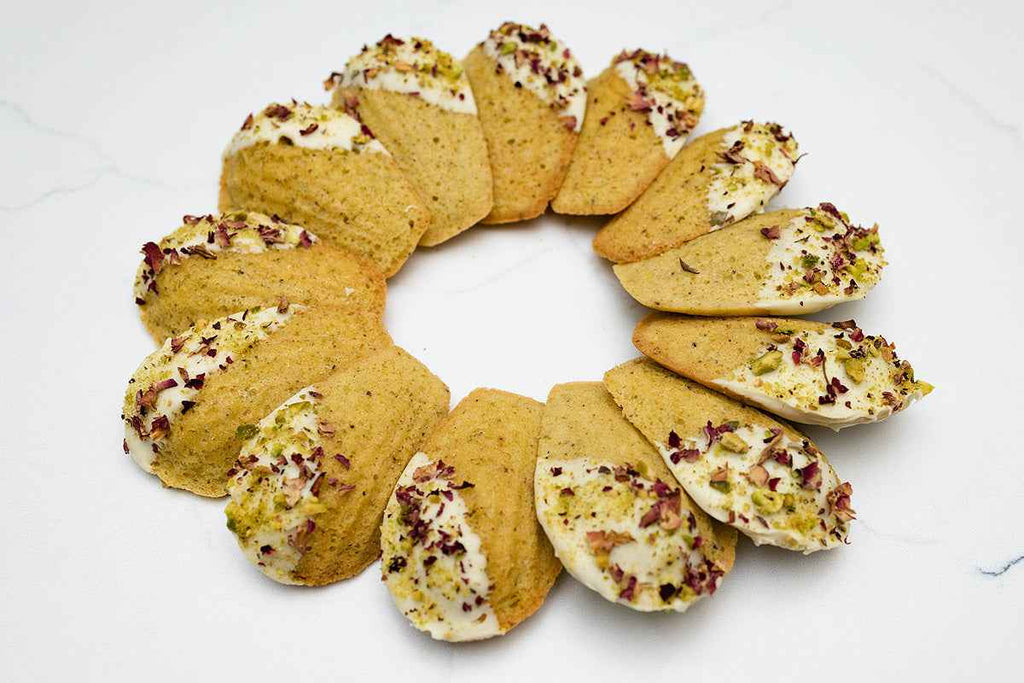 Madeleines look like cookies but are actually mini cakes. The French confection’s key characteristics are a shell shape on one side & a signature hump on the other. This version features two classic ingredients found in Persian & Indian desserts - rose water & ground pistachios. Dipped in white chocolate & decorated with a sprinkling of rose petals & crushed pistachios, this sophisticated, exotic dessert is sure to melt the hearts of your loved ones.